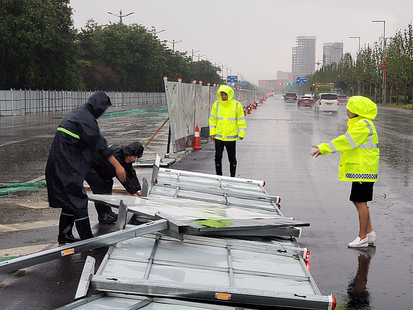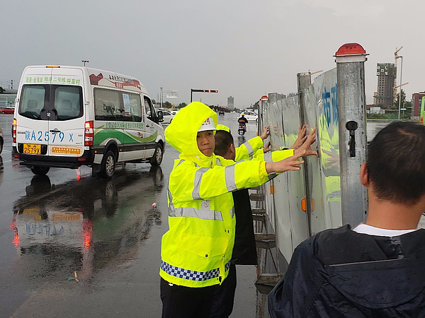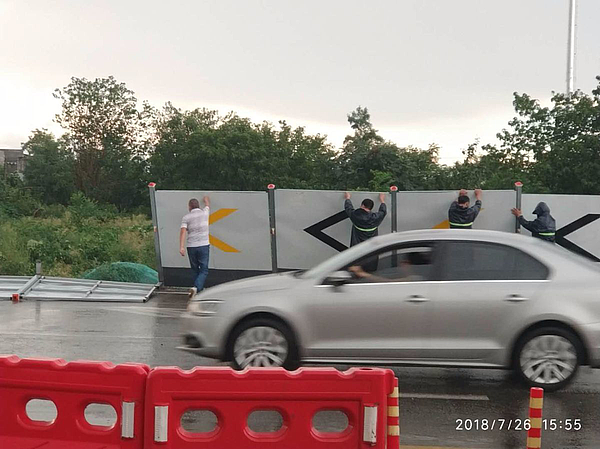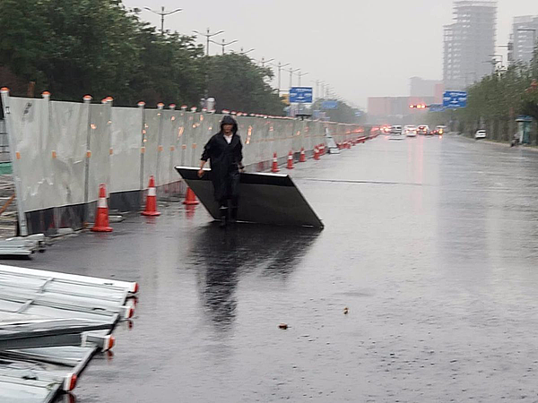 风太大啦,围挡都被吹到了路中间。围挡恢复过程中,一名同志必须冒雨拦下急速飞驰的汽车,保证其他搬移围挡的同志安全。